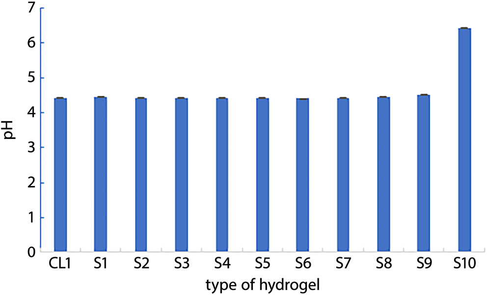 The osmotic pressure measurements for the CL1 and S1–S10 hydrogels ranged from 160 mOsm/kg H2O to 1,480 mOsm/kg H2O. Virtually all hydrogels were found to be hyperosmotic relative to living tissues, with the exception of formulation S10, which exhibited osmotic pressure values below physiological levels. The exact results of the osmotic pressure measurements are shown in Table 2. Values of pH were determined for examined (CL1 and S1–S10), The pH of gels S1–S9 ranged from 4.4 to 4.5, while a value of 6.4 was obtained for the 5 wt% aqueous sucrose solution (S10). The pH for CL1 was measured at 4.4. All results are presented in Figure 1.