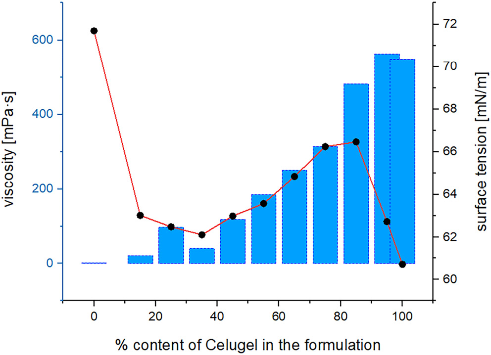 Results. The composition of the formulation has a significant impact on the osmotic pressure. Nearly all of the hydrogels exhibited hyperosmotic characteristics relative to living tissues, with measured osmotic pressure values ranging from 160 mOsm/kg H2O to 1,480 mOsm/kg H2O. As anticipated, the viscosity of the formulations increased proportionally with the growing concentration of Celugel ranging from 2.19 mPa·s to 562.87 mPa·s.