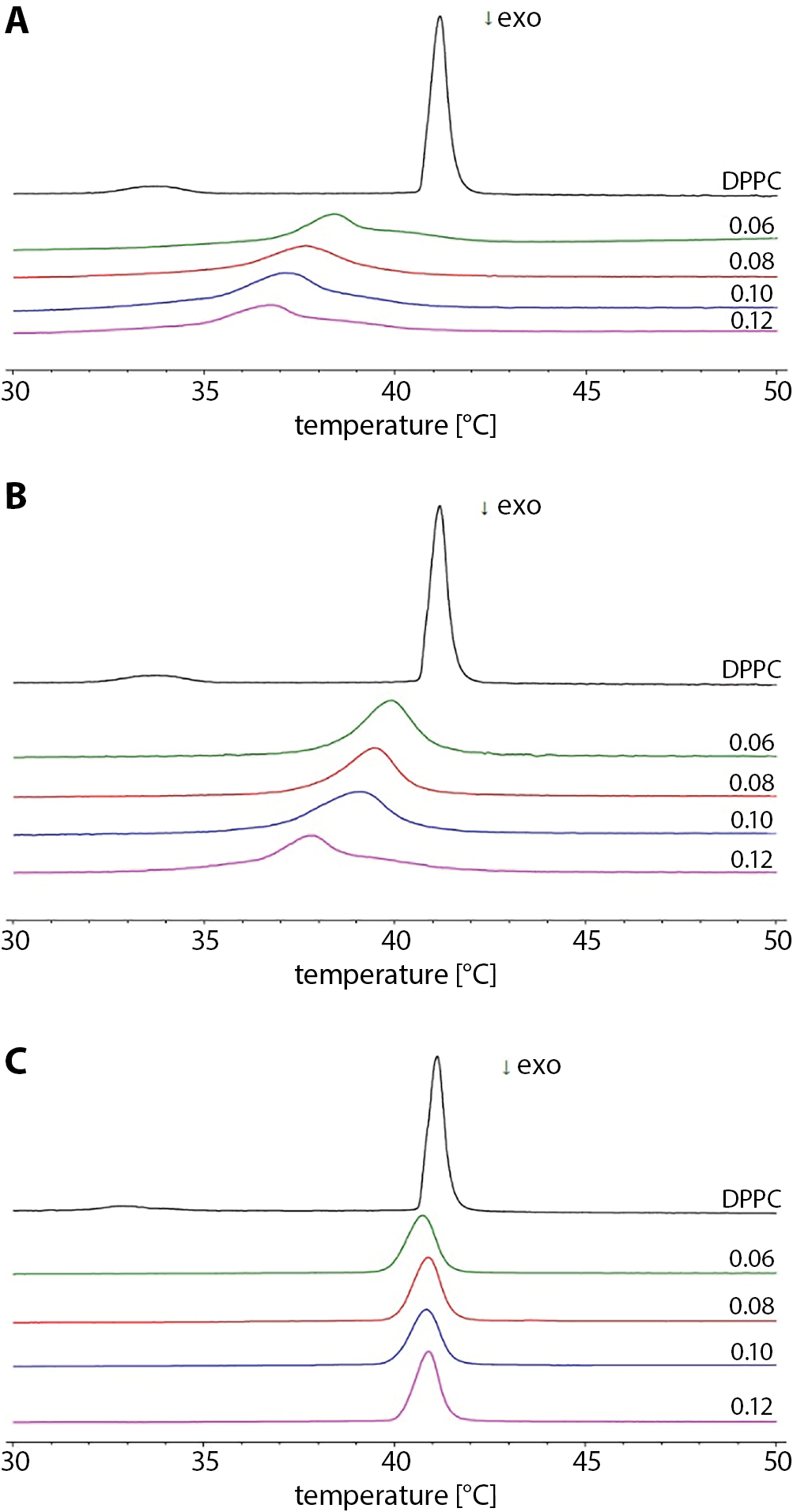Wyniki. Wszystkie badane związki obniżały temperaturę głównej przemiany fazowej DPPC w sposób zależny od stężenia. Dodanie badanych związków do DPPC skutkowało również poszerzeniem pików przemiany. Ponadto wszystkie badane związki obniżyły entalpię głównej przemiany fazowej DPPC. W przypadku wszystkich parametrów przemiany fazowej ze struktury żelu w strukturę ciekło-krystaliczną DPPC najwyraźniejsze efekty stwierdzono dla związku PR51.