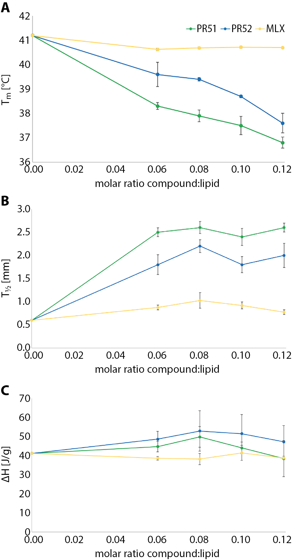 The influence of PR51, PR52 and MLX on phospholipid gel-liquid crystalline phase transition parameters – temperature (Tm), the transition peak half-height width (ΔT½) and enthalpy (ΔH) – are shown in Figure 2. The addition of studied compounds to the DPPC multi-lamellar structures increased the main transition peak half-height width (Figure 2B). It also caused concentration dependent lowering of the Tm values (Figure 2B). The addition of compound PR51 perturbed the DPPC phase transition profiles most effectively.