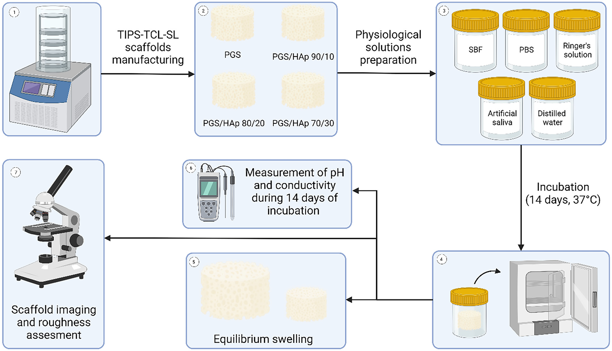 As the physico-chemical and mechanical properties as well as cytocompatibility with L929 fibroblast cells of the very same materials was reported previously,22 this study puts an emphasis on the behavior of the PGS and PGS/HAp scaffold materials during incubation. It is crucial to investigate the behavior of the biomaterial in various conditions and incubation fluids in order to consider further clinical application. Graphical scheme of the study is presented in Figure 1.