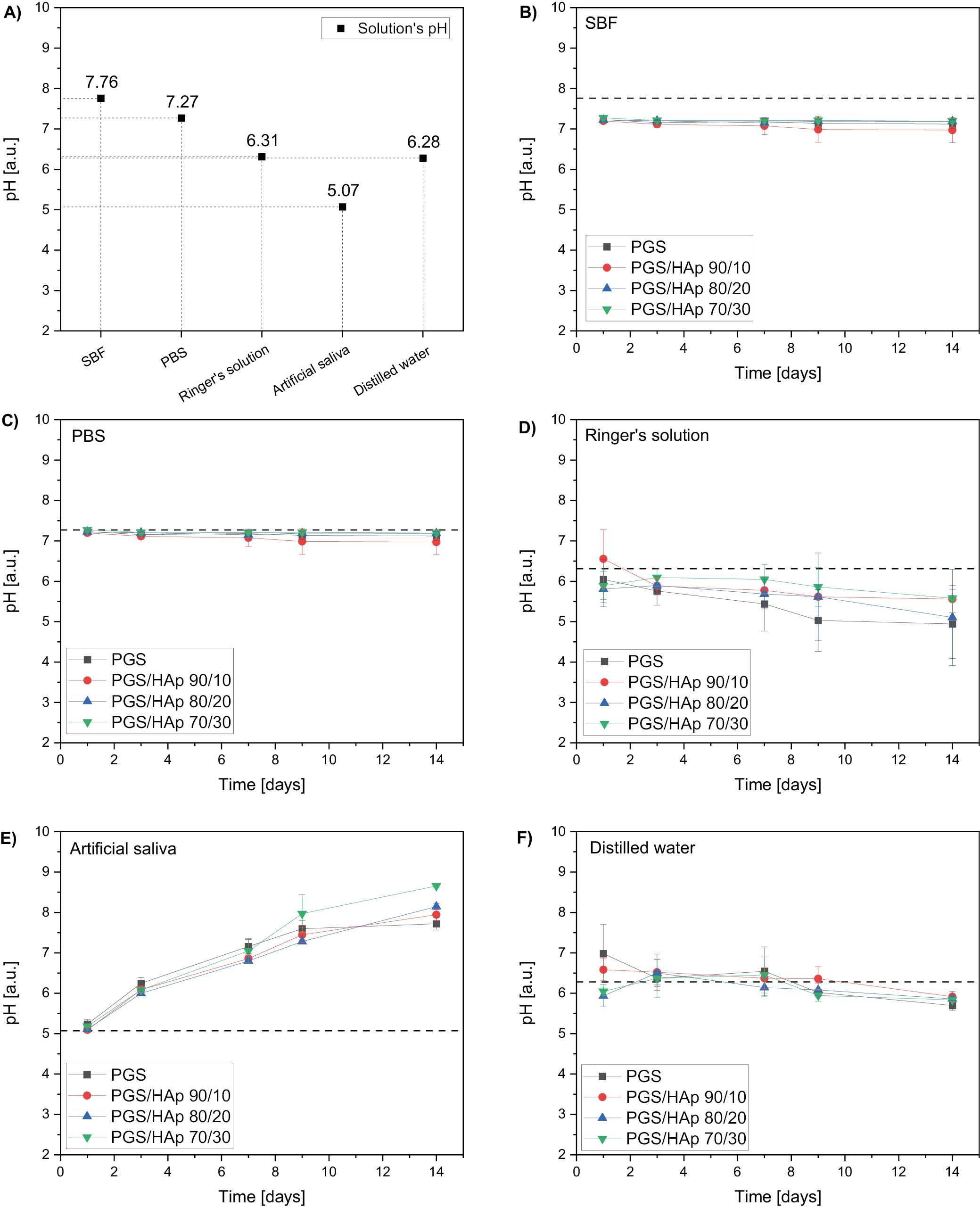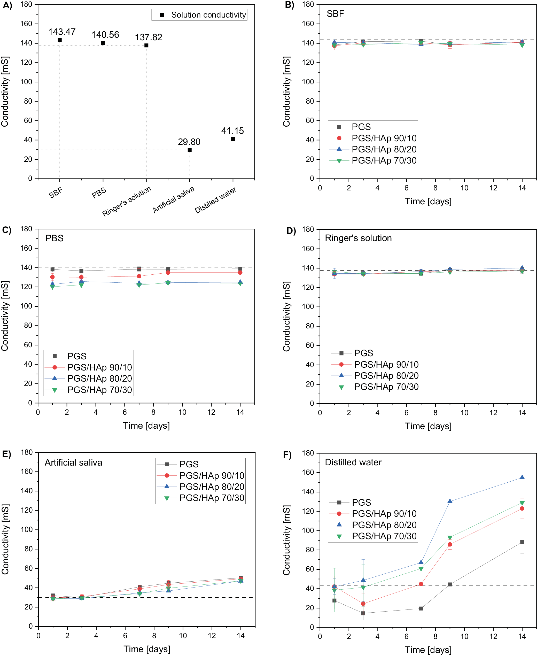 Values of conductivity change with the concentration of the ions during incubation in the environment of solutions imitating physiological conditions.33 Measured values for the reference solutions were 143.5 mS for SBF, 140.6 mS for PBS, 137.8 mS for Ringer’s solution, 29,8 mS for artificial saliva, and 41.2 mS for distilled water. The conductivity remained approximately constant for SBF and Ringer’s solution. In PBS, the measurements were also constant. However, they were slightly lower the buffer’s reference value. In artificial saliva, a slight increase in measured property was noted (from ~30 mS to ~50 mS for all materials). The highest increase was observed in distilled water (even by 400% for PGS/HAp 80/20).