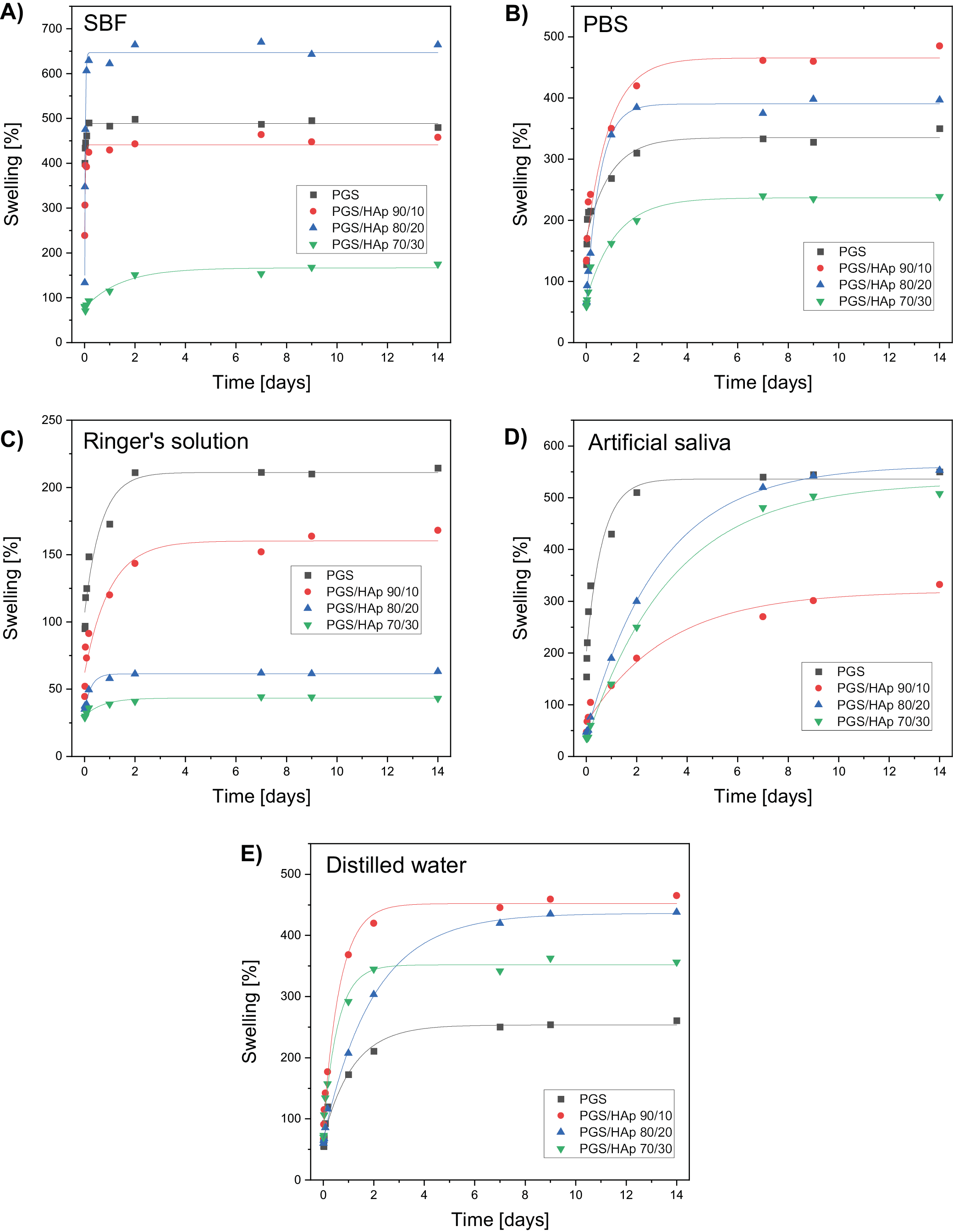 In G1, the material with lowest equilibrium swelling was PGS/HAp 70/30 with Se of 166.7% in SBF and 236.7% in PBS. It is worth mentioning that in SBF, except for PGS/HAp 70/30 sample, all other materials possessed the highest τ for all measured samples and therefore their swelling was the swiftest. In Ringer’s solution (G3) the Se swelling was the lowest among all solutions and gradually lowered with the concentration of HAp (from 211% for PGS down to 43% for PGS/HAp 70/30). The highest τ values (except for PGS) were observed in artificial saliva, indicating the highest time required to achieve full swelling capacity (3.20 for PGS/HAp 90/10, 2.91 for PGS/HAp 80/20 and 3.39 for PGS/HAp 70/30). In H2O, PGS exhibited lowest Se (211%) and PGS/HAp 90/10 the highest (452%). In G3 no direct correlations between pH, conductivity and Se is present.