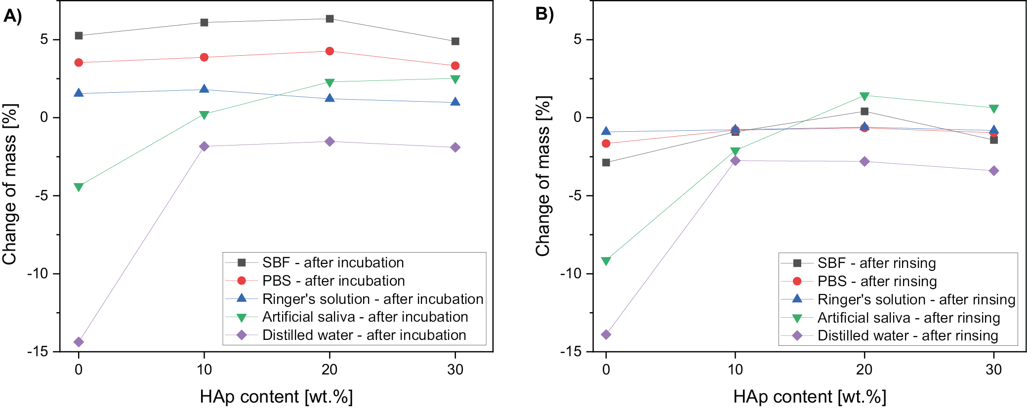 The change of scaffolds mass after the incubation is presented in Figure 5. Samples were weighted directly after drying from incubation solutions (Figure 5A) and after subsequent rinsing overnight in distilled water (Figure 5B). For all scaffolds incubated in SBF, PBS and Ringer’s solution, the change of mass was positive, weighted after drying straight from the incubation solutions.
