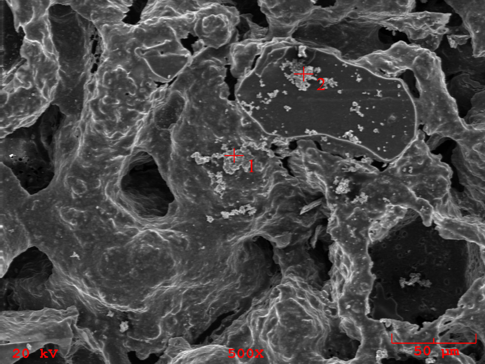 Moreover, the SEM imaging and EDS measurement revealed that for sample incubated in SBF, crystallized domains of salts present in the buffer composition were observed (Figure 6). The accurate areas of EDS measurements are indicated as red marks on the SEM image. The detailed elemental composition is presented in Table 4. Most importantly, the majority of abundance consists of Na and Cl elements not present in the initial sample before incubation. The EDS measurement and SEM imaging performed on reference PGS and PGS/HAp scaffolds before incubation showcased the morphology and confirmed presence of apatite filler.22
