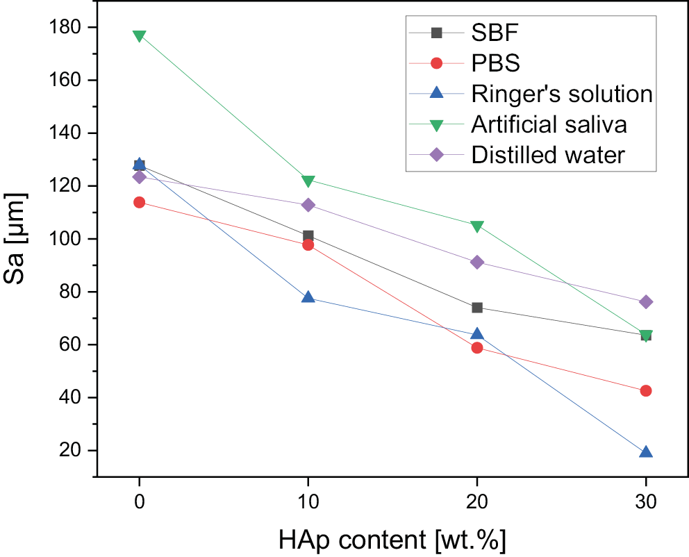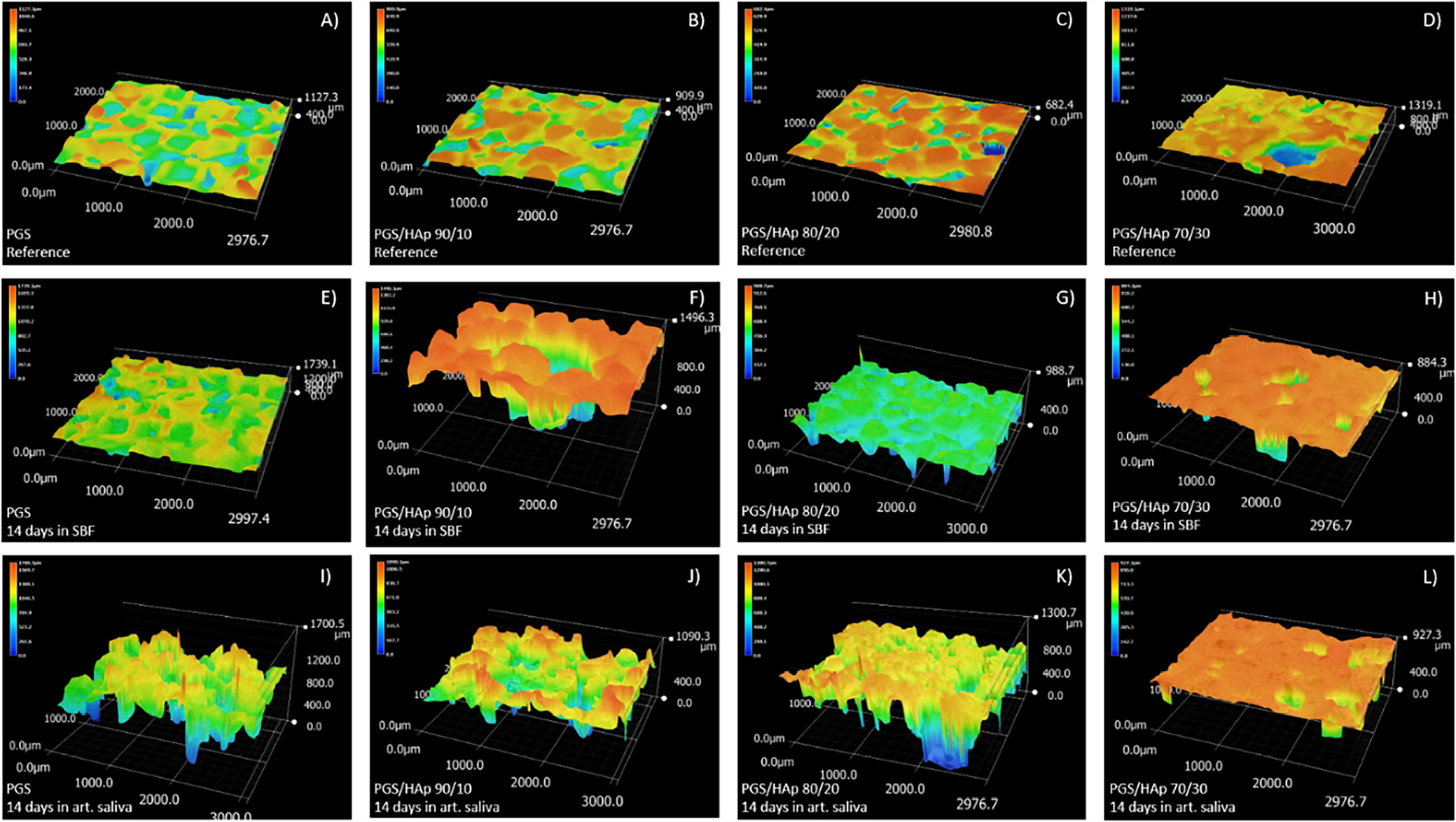 The morphological changes are depicted by the evolution of the surface roughness measurement basing on 3D reconstructions from the optical microscope (VHX Series Digital Microscope; Keyence) (Figure 7). For the reference samples before the incubation, a decrease in roughness can be observed as the amount of apatite filler increases: 132.2 μm for PGS, 116.6 μm for PGS/HAp 90/10, 89.0 μm for PGS/HAp 80/20, and 80.6 μm for PGS/HAp 90/30. This downward trend with the increasing amount of HAp persisted for all utilized solutions. Surface roughness before and after incubation is also presented in the Table 5.