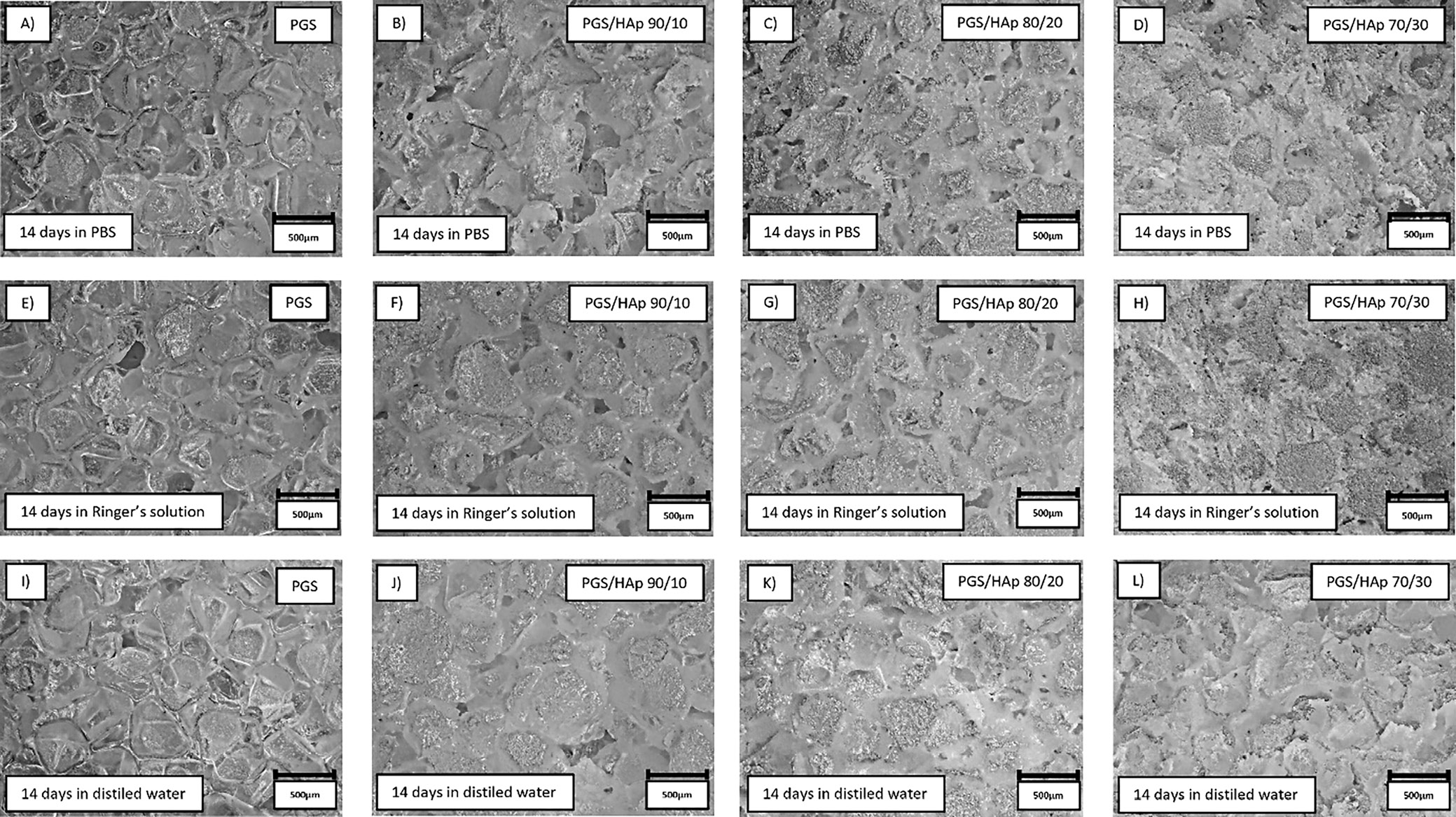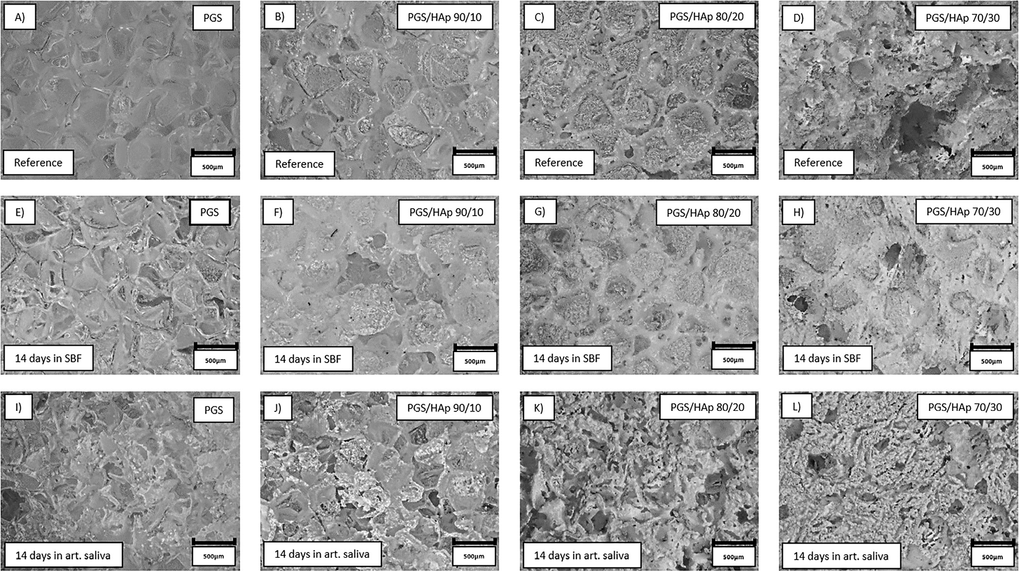 The changes in surface roughness of the scaffolds might indicate either deposition on new HAp particles or salts present in the solutions. In case of polymer scaffolds, the HAp is not present and thus the gain in mass is due to the plausible crystallization of the salts present in solutions. This hypothesis was confirmed by decrease in mass for all samples incubated in distilled water, which does not contain statistically significant concentrations of ions. The increase of the pH value during incubation in artificial saliva was the greatest among all measured solutions, which might be an indication of degradation process occurring.41 This was confirmed by loss in mass for PGS sample (approx. −5%). For specimens containing the apatite filler in artificial saliva, the mass change was positive – again most probably due to the salts present in the solution. The initial conclusion regarding crystallization of salts from incubation solutions was supported with changes in mass after subsequent rinsing in water before drying following incubation. Noticeably, the roughness of samples incubated in the distilled water overlapped with the reference values almost ideally. Moreover, the presented data indicate that the artificial saliva was the only solution for which the roughness was greater than for the reference sample. It might be yet another indication of degradation process occurring in this solution. For all other physiological solutions (SBF, PBS and Ringer’s solution), the roughness was lowered in comparison with the reference. Therefore, deposition of additional layers on top of the scaffolds might have occurred. As it is clearly visible after incubation in SBF, deposition of additional layers on the surface was observed, while in saliva, the structure appear more frayed and degraded, except for PGS/HAp 70/30 sample.
