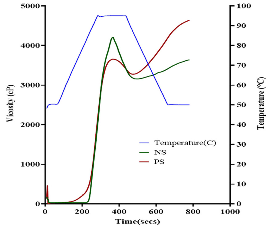 In Table 3 and Figure 2, NS exhibited a higher peak viscosity (4204 cP vs 3655 cP) and higher breakdown viscosity (1048 cP vs 379 cP) compared to PS. Although both forms exhibited the same peak time of 6.07 min, PS presented a lower pasting temperature (78.25°C vs 84.10°C) and higher final viscosity (4638 cP vs 3635 cP).