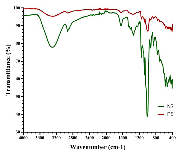 The FT-IR spectra (Figure 3) showed that the NS had pronounced absorption peaks around 3200 cm–1 (O-H stretching) and in the fingerprint region below 1200 cm–1 (C-O stretching and C-O-H bending). In contrast, the PS exhibited lower absorption peaks.