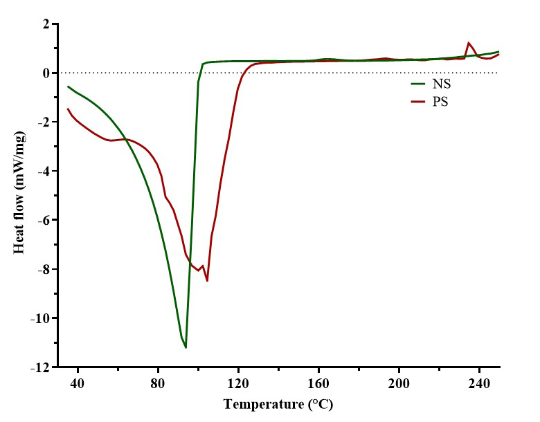 In the differential thermograms (Figure 5), NS showed a single, sharp endothermic peak around 100°C and a smooth, continuous curve from 40°C to 93°C, whereas PS showed a broader endothermic region around 80–120°C, multiple peaks in the endothermic region, and a small exothermic peak near 240°C.