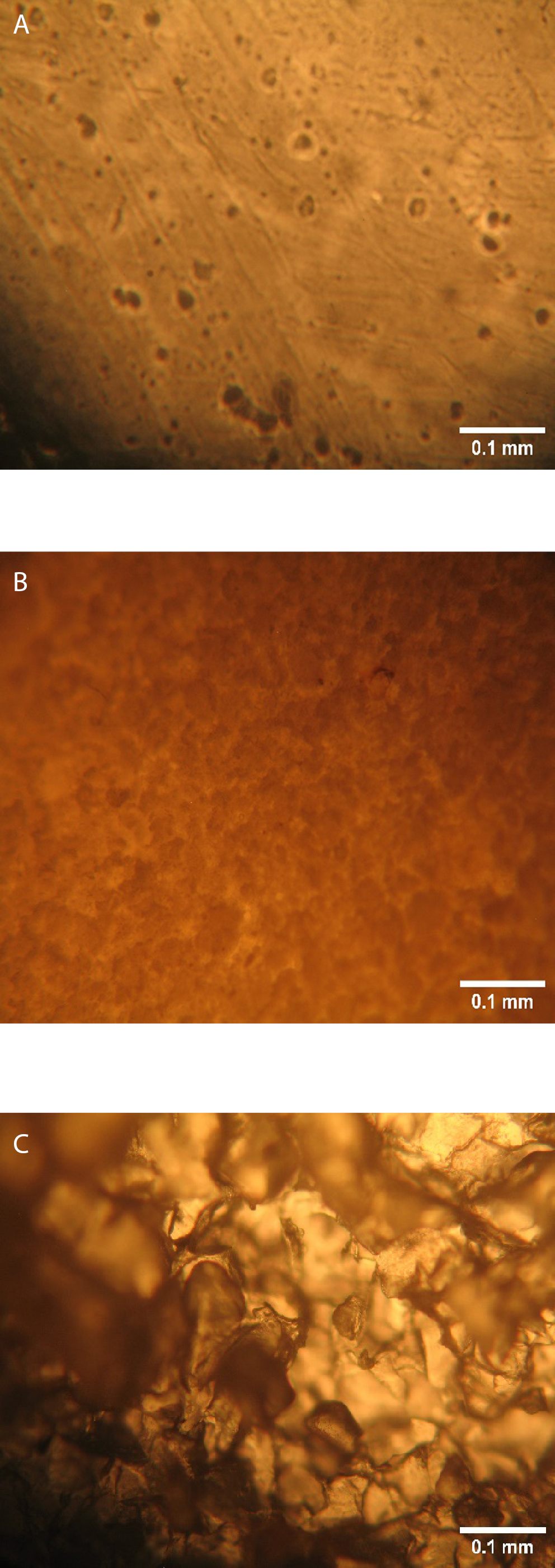 The surface morphology of the films was examined using a light microscope (Zeiss Axioskop 40; Carl Zeiss AG, Oberkochen, Germany) fitted with a digital camera (Canon PowerShot A620; Canon, Tokyo, Japan), which was used to take photomicrographs. Cut samples of 1 × 1 cm were placed on microscope slides using a forceps and viewed at ×10 magnification.